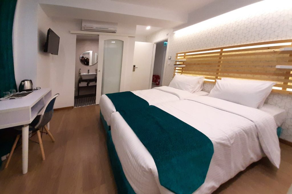 Υπέροχη διαμονή για όλη την οικογένεια σε δύο δωμάτια που επικοινωνούν με 2 μονά κρεβάτια 90 Χ 2,00 και 1 διπλό κρεβάτι 1,60 Χ 2,00 ή 4 μονά κρεβάτια . Κατόπιν αιτήματος μπορεί να προστεθεί παρκοκρέβατο.
